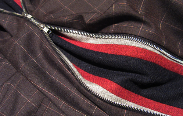すでに定番化している両サイドにフルファスナーを配置した「Pano Pants」。その履きこなし方は自由。ファスナー全開でインナーのスクールマフラー風生地切り替えを楽しみながら、ビックシルエットパンツとして履くも良し。オールクローズドでラインの綺麗なウールパンツとして履くも良し。中途半端にアレンジしたファスナー位置もそれまた楽しい!