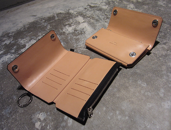 同じくスタッズウォレット。こちらは3つ折りバージョン。カード入れ+小銭入れが付いたスタンダードモデル。こちらもメッセージが刻印されたリング付き。エイジングを楽しめるヌメ革を使用した新色のタンカラーに真鍮スタッズと定番のブラックレザーにニッケルスタッズの2色展開。従来の物からサイズを修正し、1万円札が折らずに入るサイズに。