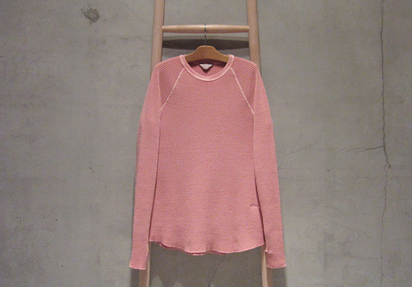 ミニ裏毛を使用したラグランスリーブのカットソー。花柄でキルトしたポケットが胸に付き、脇サイド部分にはスリットが入ります。丁度良いお湯加減の一枚。