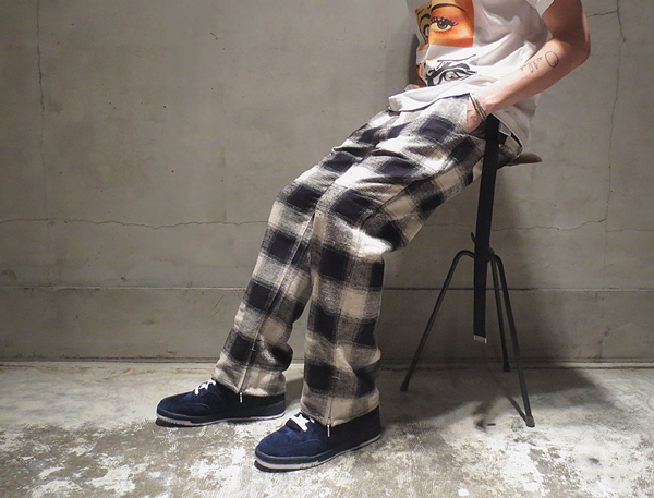 同じく厚手チェックネル生地を使用したワイドパンツ。こちらも長めのガチャベルトが付属します。セットアップという選択が「逃げ」なのか、「攻め」なのかは貴方次第です。