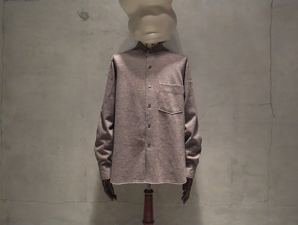 上記のセットアップと同様のコンセプトで展開されるウールシャツ。しっかり感のあるウール地を断ち切りにて使用。スタンドネックの様にも見える極小の叩き付け襟も見所。裾はほど良くラウンドカット。セットアップのインナーにご提案したいカラーリングです。