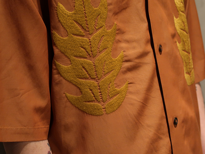 キュプラと細番手コットンを高密度に織り込んだ生地を使用したオープンカラーシャツ。ややゆったりとしたシルエットとフロントに配置された柊の刺繍がなんとも言えない存在感を演出。古来より魔除けのシンボルとして使わせている柊を、現代のファッションと重ねた意匠が同ブランドらしい一枚です。