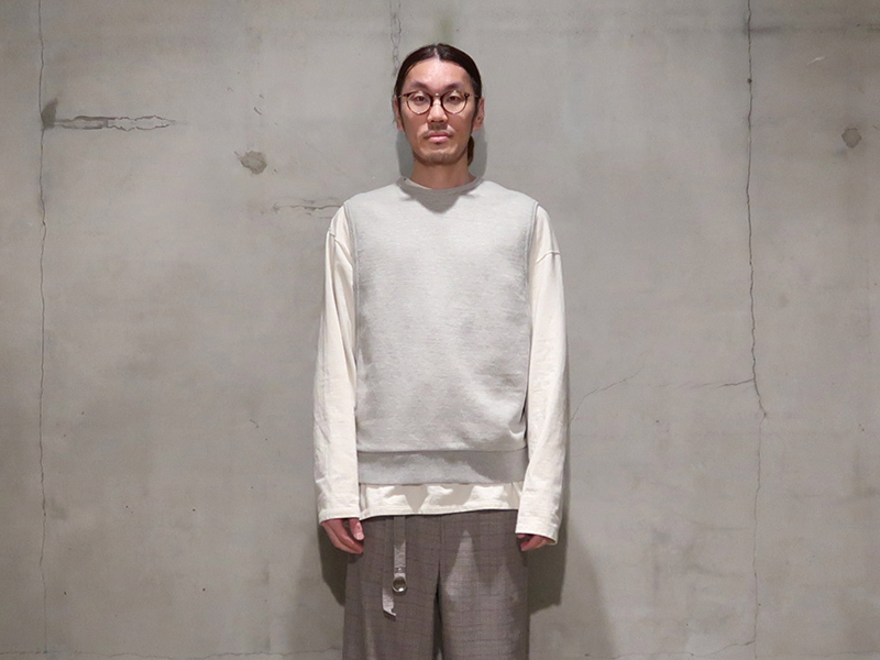 同じく、Ocean Grayと名付けられたテクニカルなオリジナルスウェット生地を使用したベスト。こちらもややゆったりとした絶妙なシルエットと素材感を前面に押し出したビジュアル、大きく開いたアームホールが特徴です。