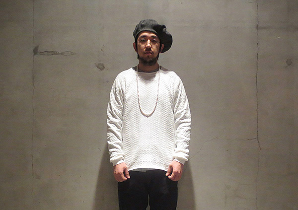 ローゲージニットのようにも見える立体的な組織が特徴のクルーネックL/T。これからの季節にとりあえず1枚的な安心感のある一品。同じくロングネックレスとのコンビネーションをプッシュ。