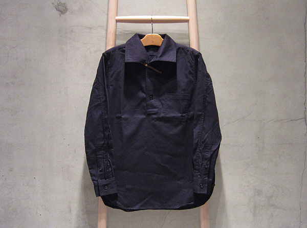 プルオーバーワークシャツの様な表情を持ちながらも花釦を使用して遊びも忘れてはいません。少し大きめな襟や少し小さめな胸ポケットが特徴的なアイテム。両脇の裾に釦がついているので、釦をとめる事により表情の変化がお楽しみ頂けます。