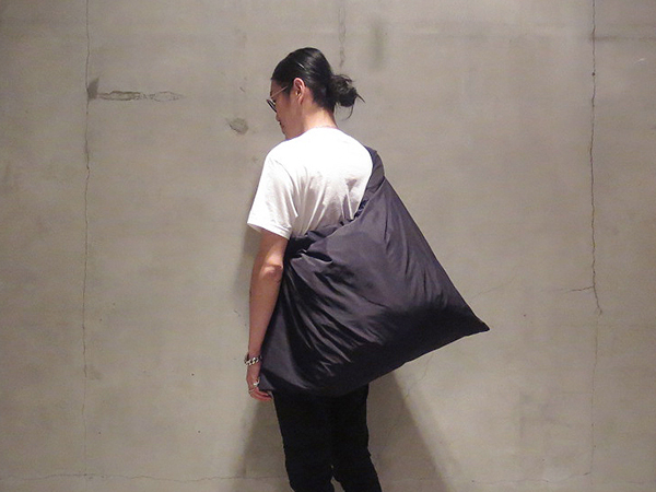 ポリエステル素材を使用した大きめのラップバッグ。とにかく沢山入るモノ。持ち手はレザーで調節機能付き。アイデア次第で様々な使い方ができるグッドプロダクツ。