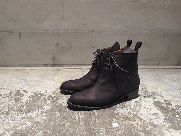 質感の良いオイルドスェードを使用したシューズ。こちらも紐無しで履けるインナーゴム入りのディティールに注目。レザーソールには蹄型のゴムを張りつけ先端は釘止め済み。マットな表情がコンテンポラリーな面構えです。
