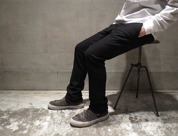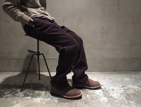 上記の太畝コーデュロイに比べると少し薄手な印象を受ける細畝コーデュロイ生地を使用した定番「FALL LEAF PANTS」。写真ではBLACKに見えますが、実はNAVY。多くを語らずとも、ご好評頂いている安心の一本。
