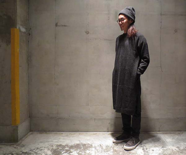 クルーネックのロングニット。サイドには深めのスリットとスルーポケット。どことなくインド風なリラックスして着る一枚。