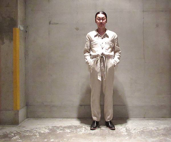 上記、ジャケットと同素材を使用したオールインワン。2018SSの新作。品の良い光沢感と生地のとろみが特徴となるリネン・シルク生地を使用。ややゆったりとしたシルエットに、midorikawaらしいディティールを惜しみなく投入した意欲作。バランス良く配置された断ち切りのヴィジュアル、複雑に計算されたシルクテープ使い、ややテーパードしたボトムのシルエットも◎。同じくデザイナーの想いが強く滲み出た逸品です。