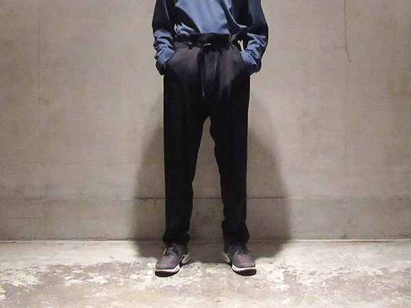 ペルー高山の山岳羊毛TOP糸のみを使用。ハリ感とコシ感を持ち、程よい上質な滑り感と光沢感が特徴。使い込むほどに味の出る独特な雰囲気と品の良さもポイント。ヒラヒラとはためく袖口に目が行く、ゆったりシルエットバギーパンツ。前期17SSのアップデート版。ドスンとした迫力が際立った一本。